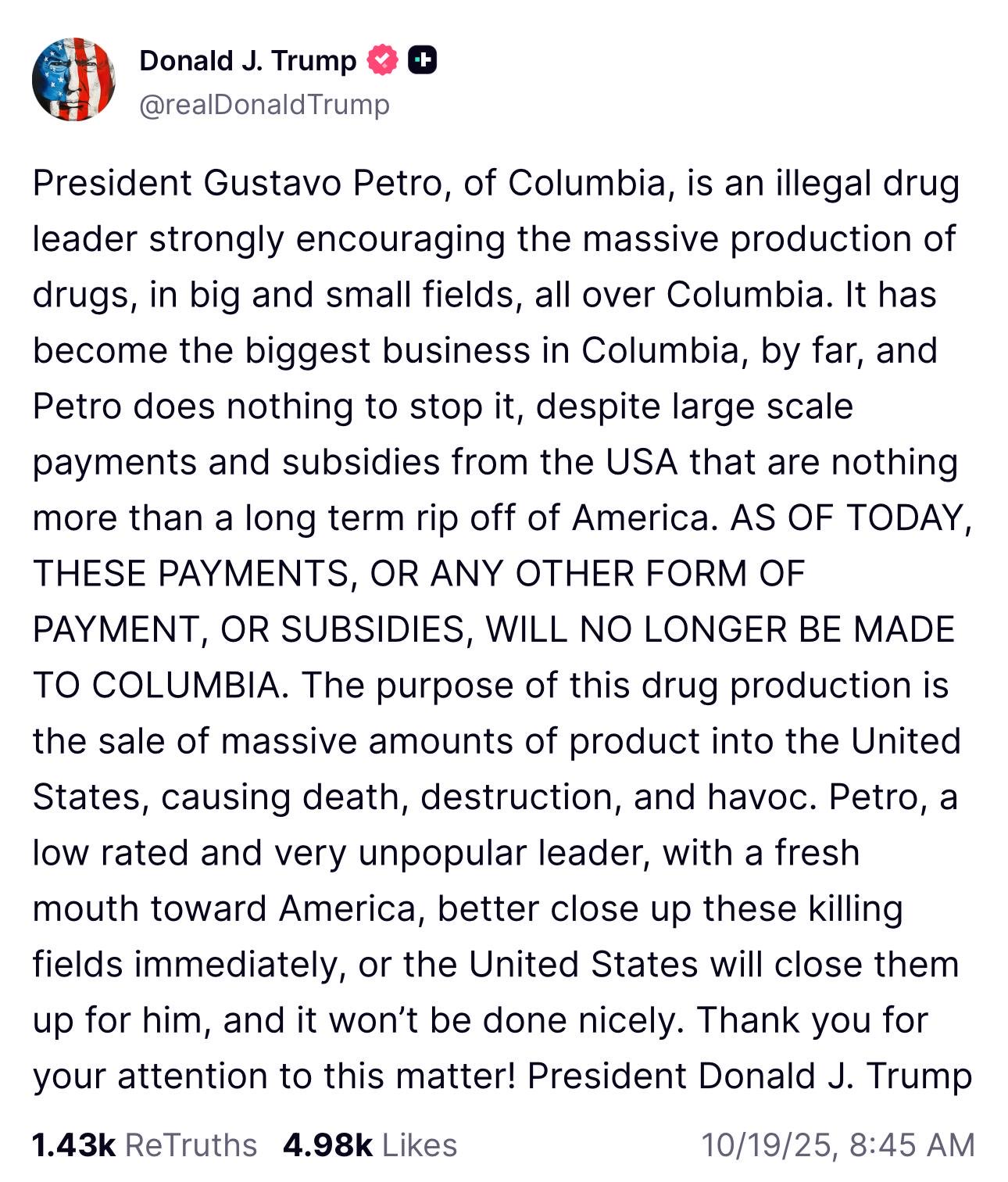 “A partir de hoy, estos pagos, o cualquier otra forma de subsidio, ya no se harán a Colombia”, escribió el exmandatario, agregando que si Petro no cierra los cultivos ilícitos “Estados Unidos lo hará, y no será de manera agradable”.