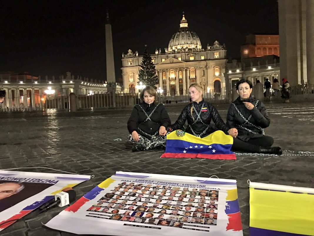 Como parte de una protesta pacífica, Lilian Tintori, junto a la madre de su esposo, Leopoldo López y Mitzy Capriles, esposa de Antonio Ledesma, se encadenaron en la Plaza de San Pedro en el Vaticano como un capítulo más de su lucha continua para lograr la libertad de los presos políticos de Venezuela.