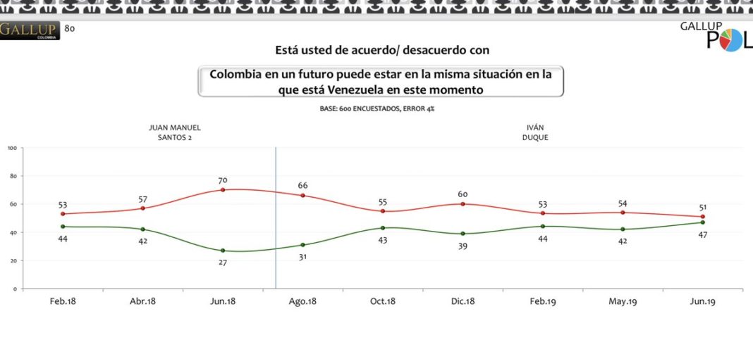 A una base de 600 encuestados, con un margen de error de 4%, les preguntaron lo siguiente: «Está usted de acuerdo o en desacuerdo con que Colombia en un futuro pueda estar en la misma situación en la que está Venezuela en este momento».