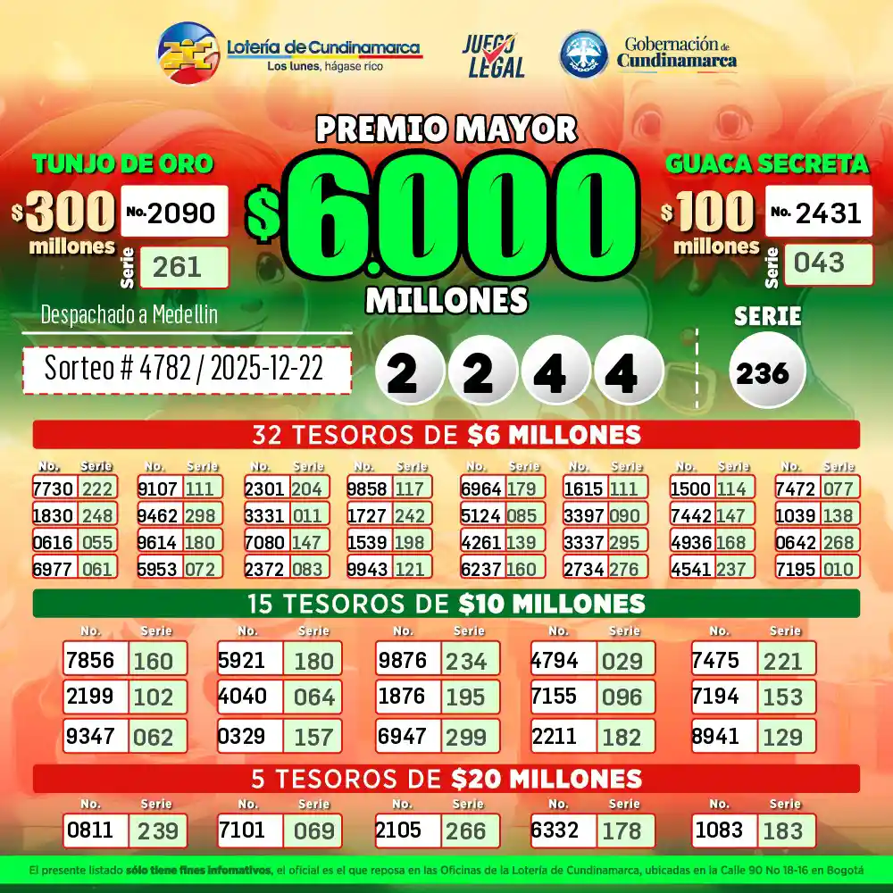La emoción volvió a apoderarse de los apostadores con el más reciente sorteo de la Lotería de Cundinamarca, celebrado este lunes 22 de diciembre de 2025. Un multimillonario premio reafirmando su posición como uno de los juegos más importantes y esperados del país.