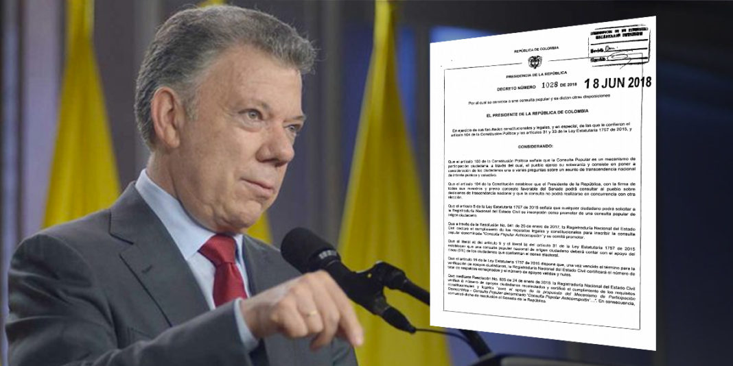 El presidente Juan Manuel Santos firmó el Decreto 1028 del 18 de junio mediante el cual se convoca a los colombianos para que el próximo domingo 26 de agosto aprueben o rechacen el mecanismo de participación ciudadana denominado “Consulta Popular Anticorrupción”.
